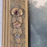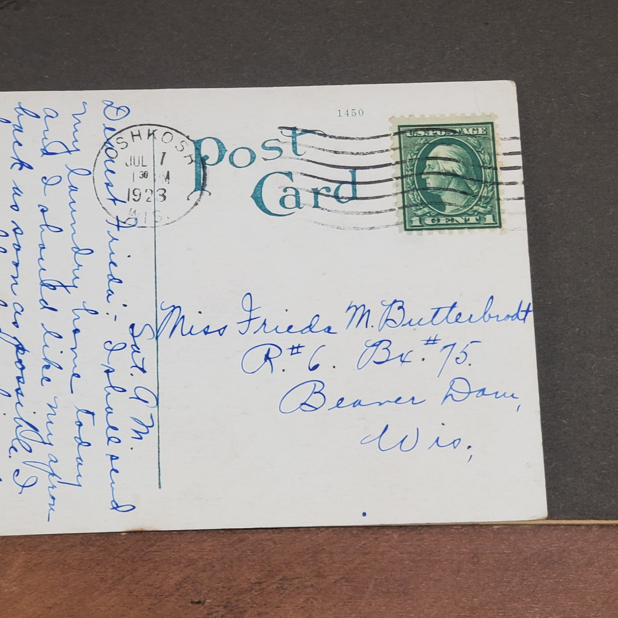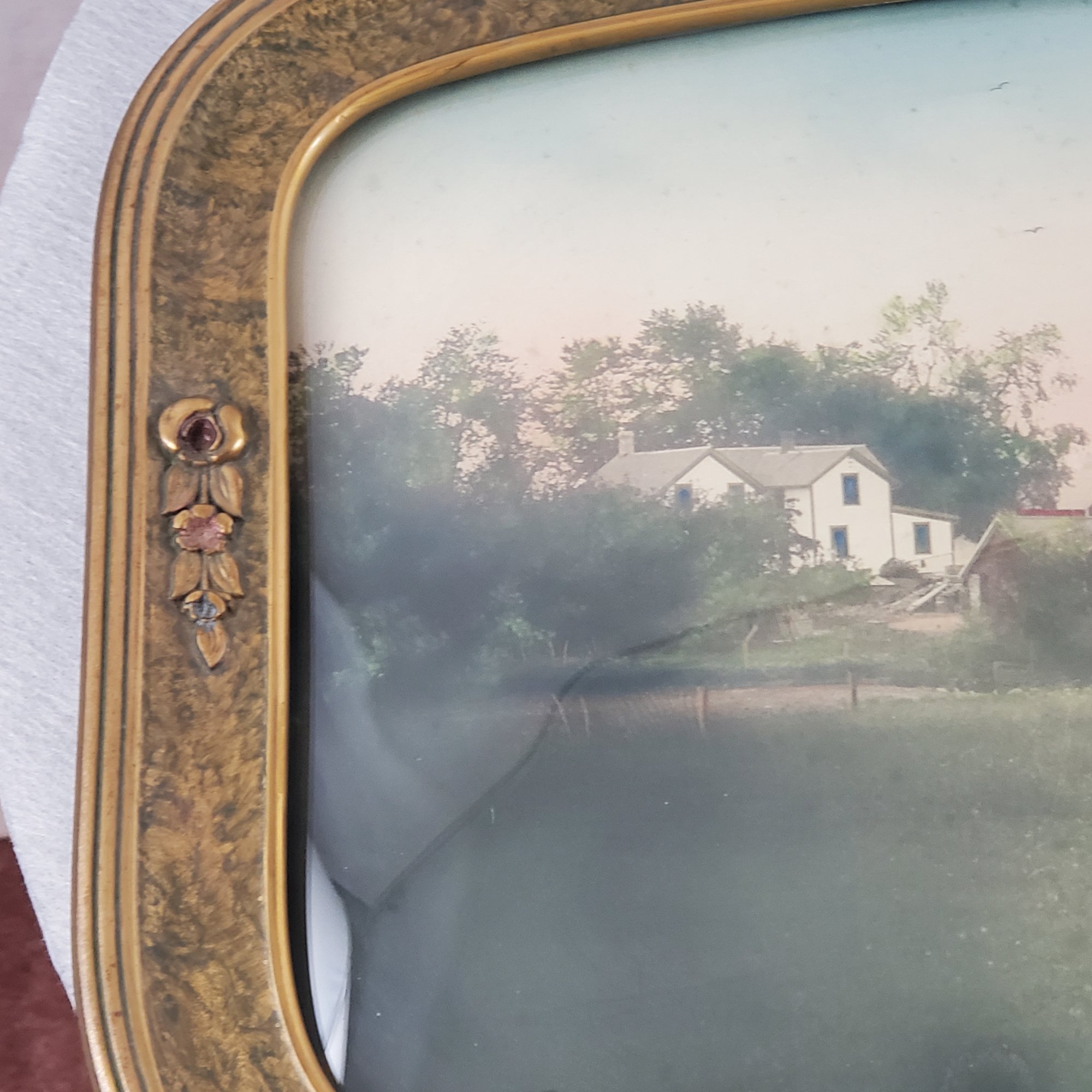 Antique picture frame with convex bubble glass in a domed frame. Rural Beaver Dam Wi. farm with documented post card of owner in between backing of picture.