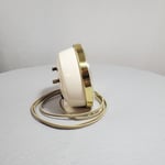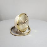 Case material is metal, Case color is painted white, Trim ring is brass, Dial material is metal, Dial color painted gold, Second hand is red under a shatter proof plastic bezel.
