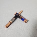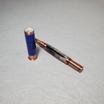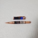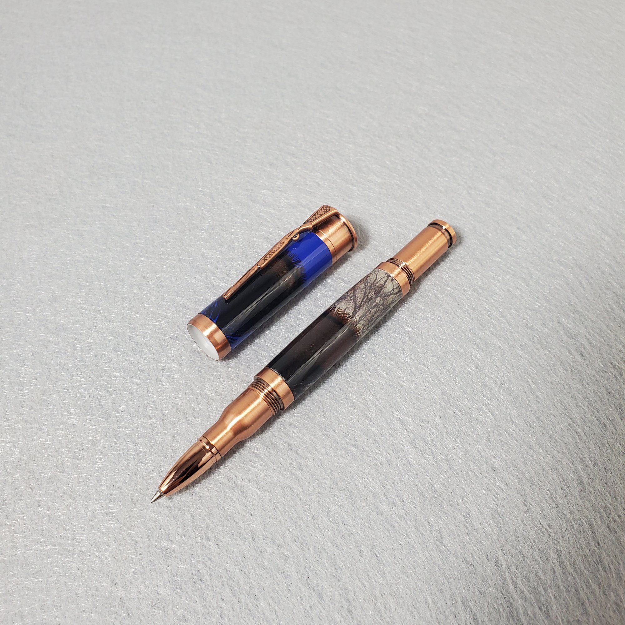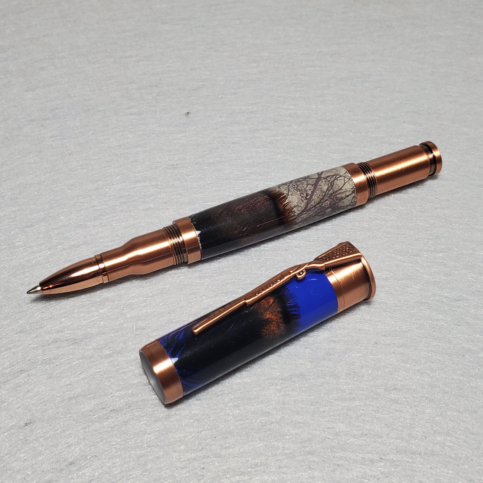Hardware on this rollerball writer is the over and under 12 gauge combination rifle/shotgun, this Rollerball pen will make the perfect gift for any hunter, sportsman, trap & skeet shooter or gun enthusiast. A 12ga shotgun shell cap, a .30 caliber bullet style pen body, and a shotgun pocket clip. This is a postable pen, as the cap can be attached to either end of the pen. This is a full sized pen, nearly 6" in length capped and 6 1/2" posted. Antique Copper plating was chosen to complement the colors in the feathers, as you turn this pen the iridescent green and bronze colors appear that are common with turkey tail feathers.