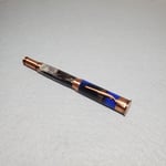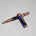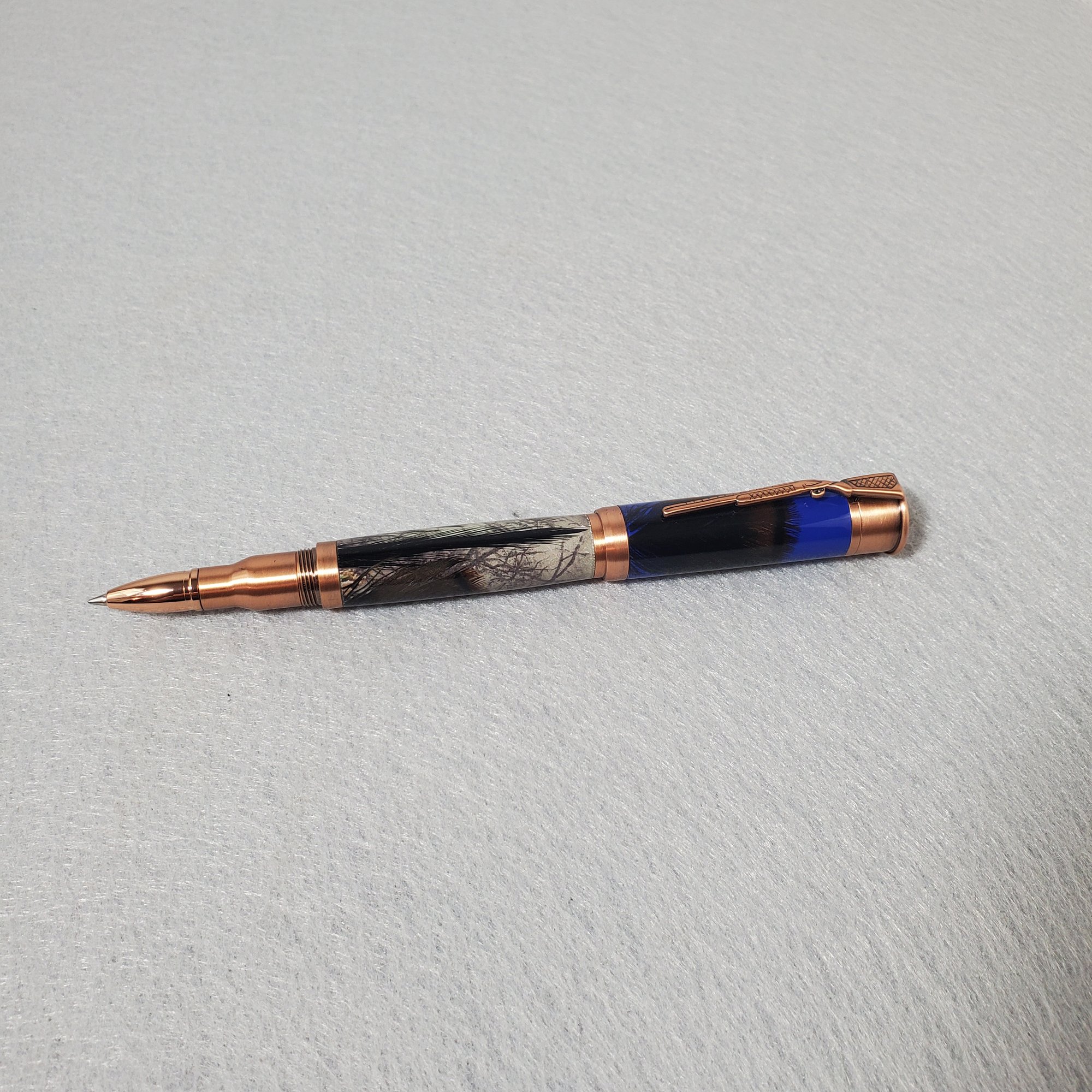 Blue 12 Gauge Shotgun Shell Rollerball Pen with Turkey Feathers, Antique Copper Finish, #0309