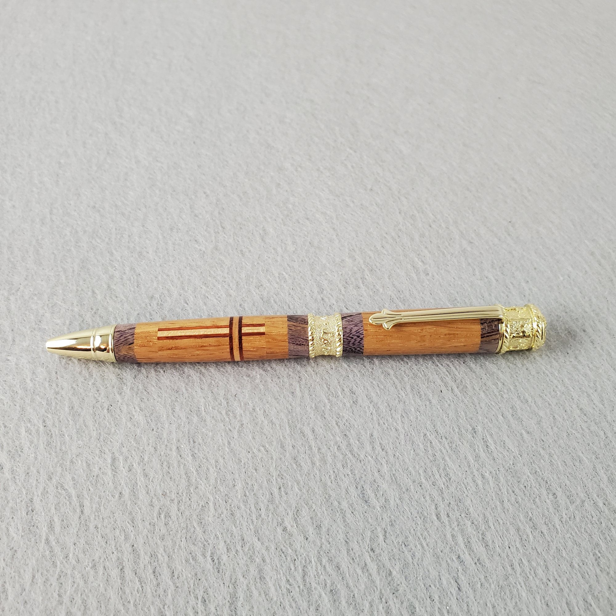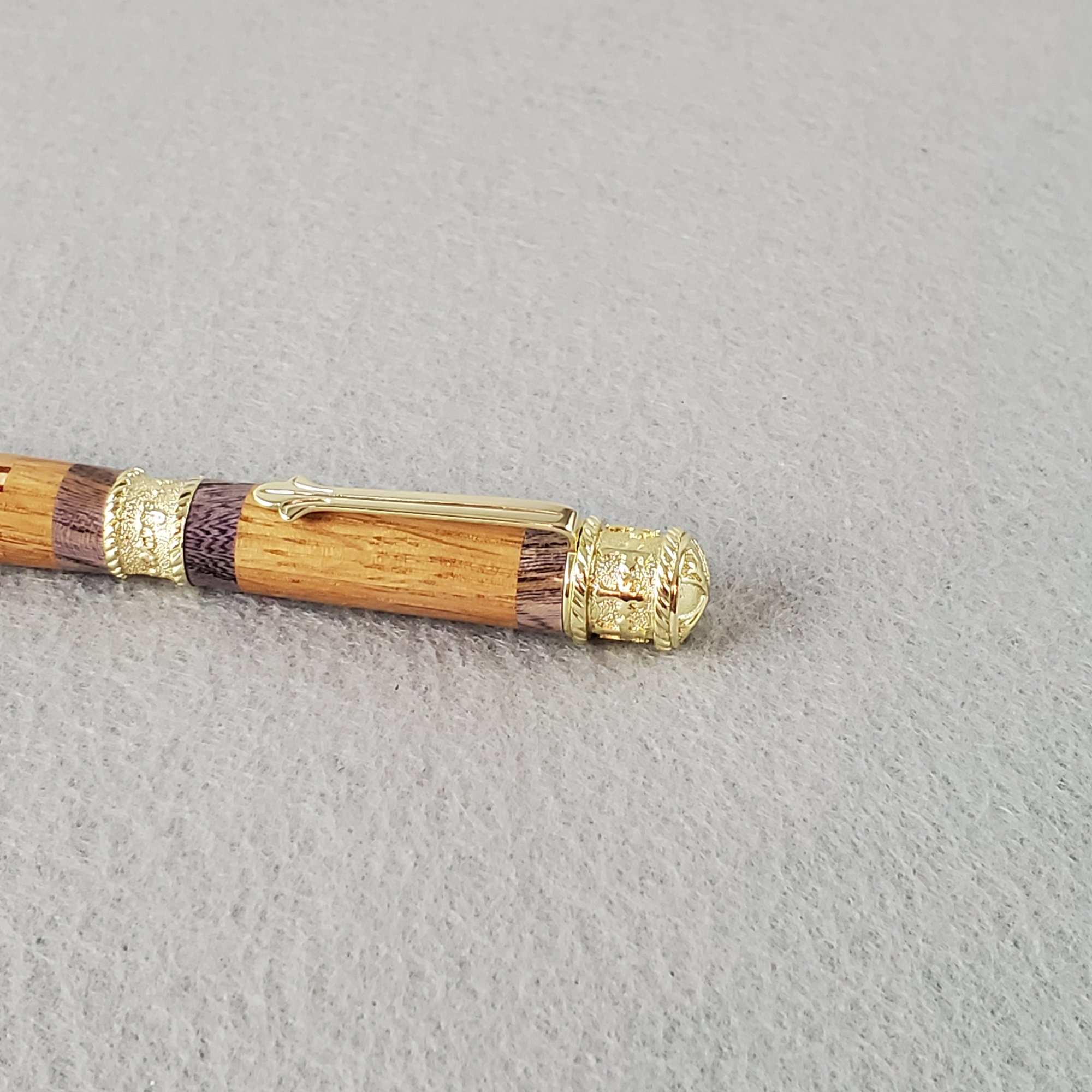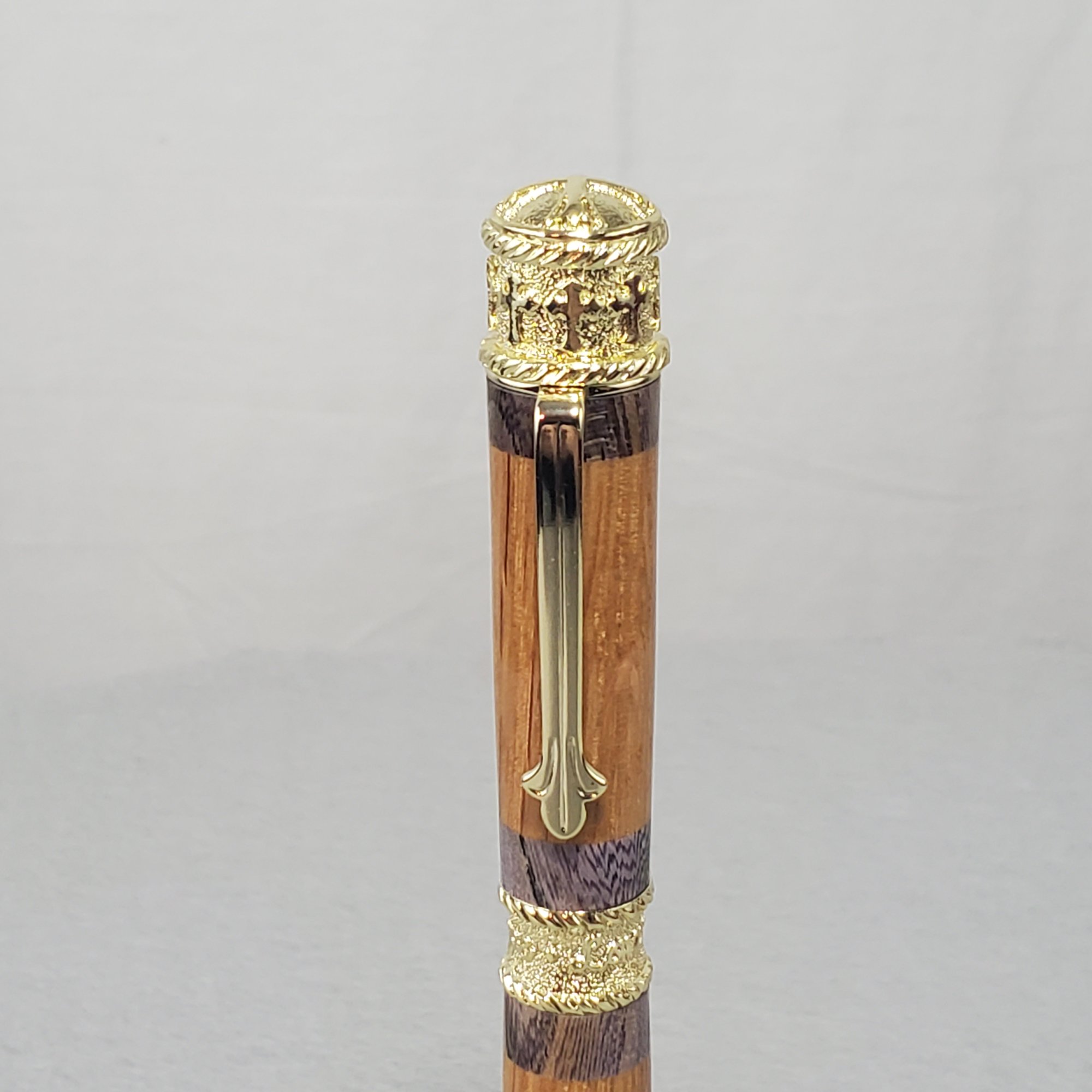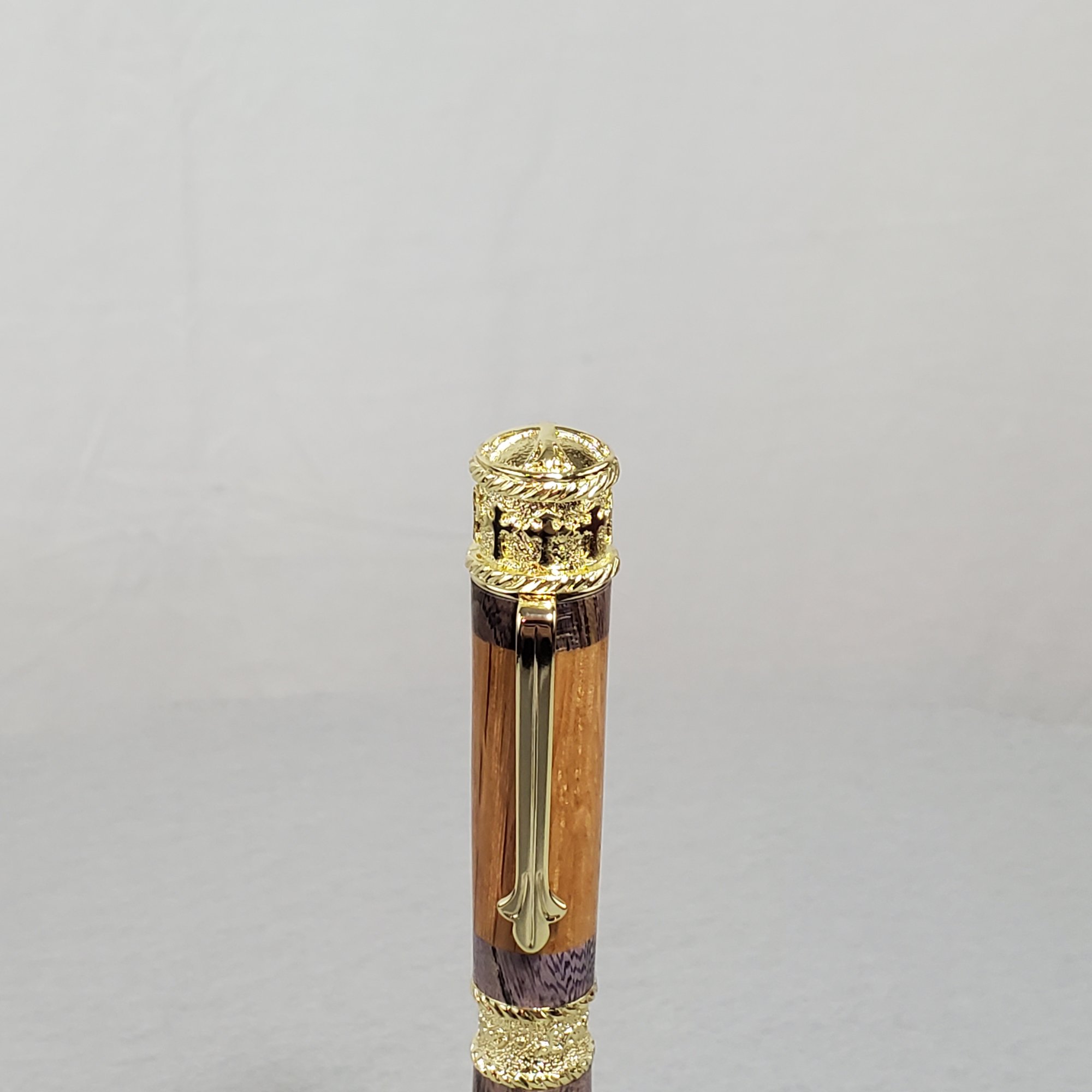 A custom ballpoint pen that was made using reclaimed wood from the interior oak trim from a church that was razed for expansion space. The pen consists of twelve pieces of wood. Two main pieces of natural oak, four pieces of stabilized purple and purple dyed wood, and six pieces of very thin laminated wood to make the cross. The cross is not a decal, as it is solid wood that runs through the entire wood blank thus giving a front and back surface.