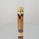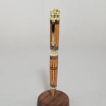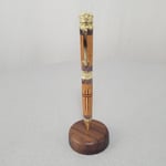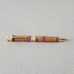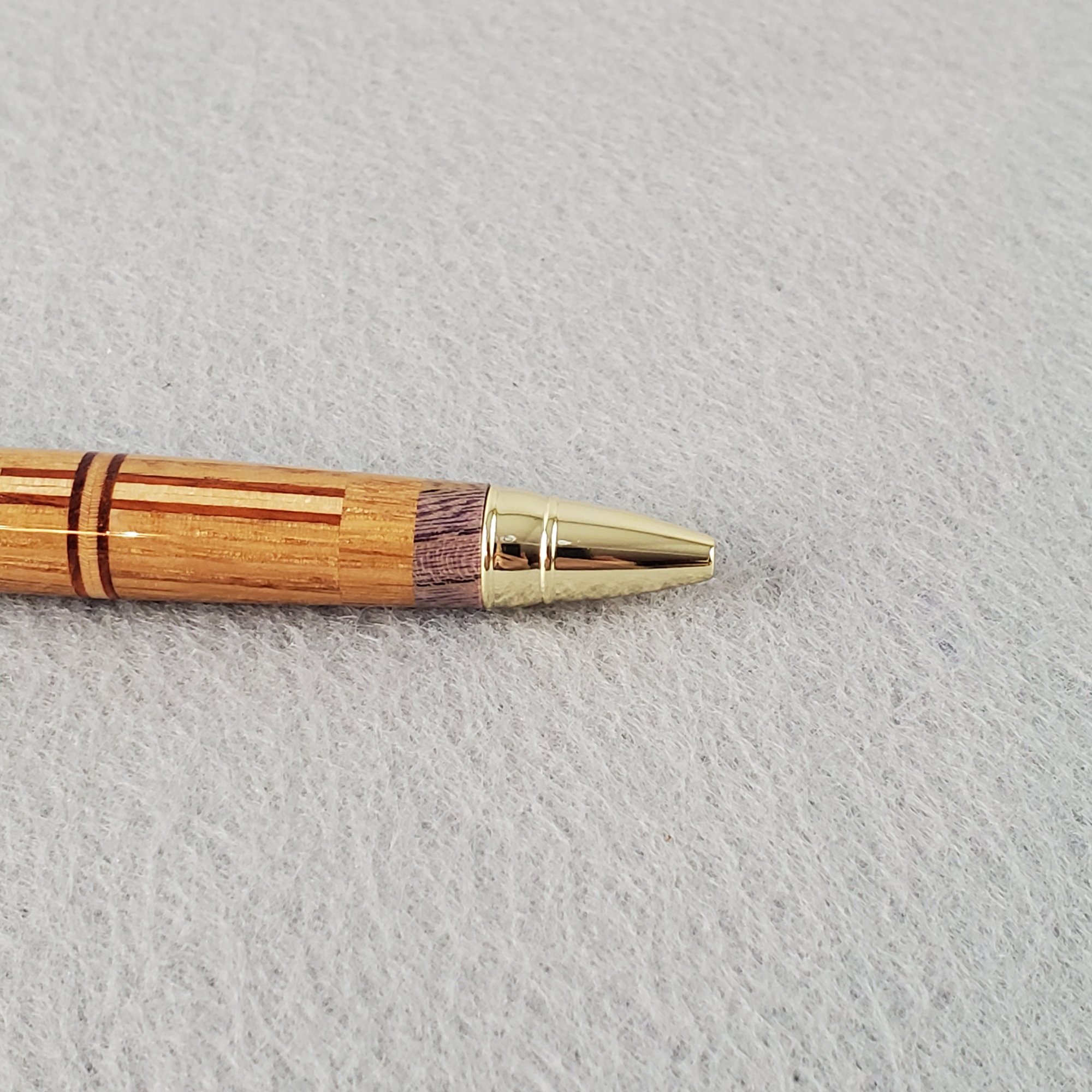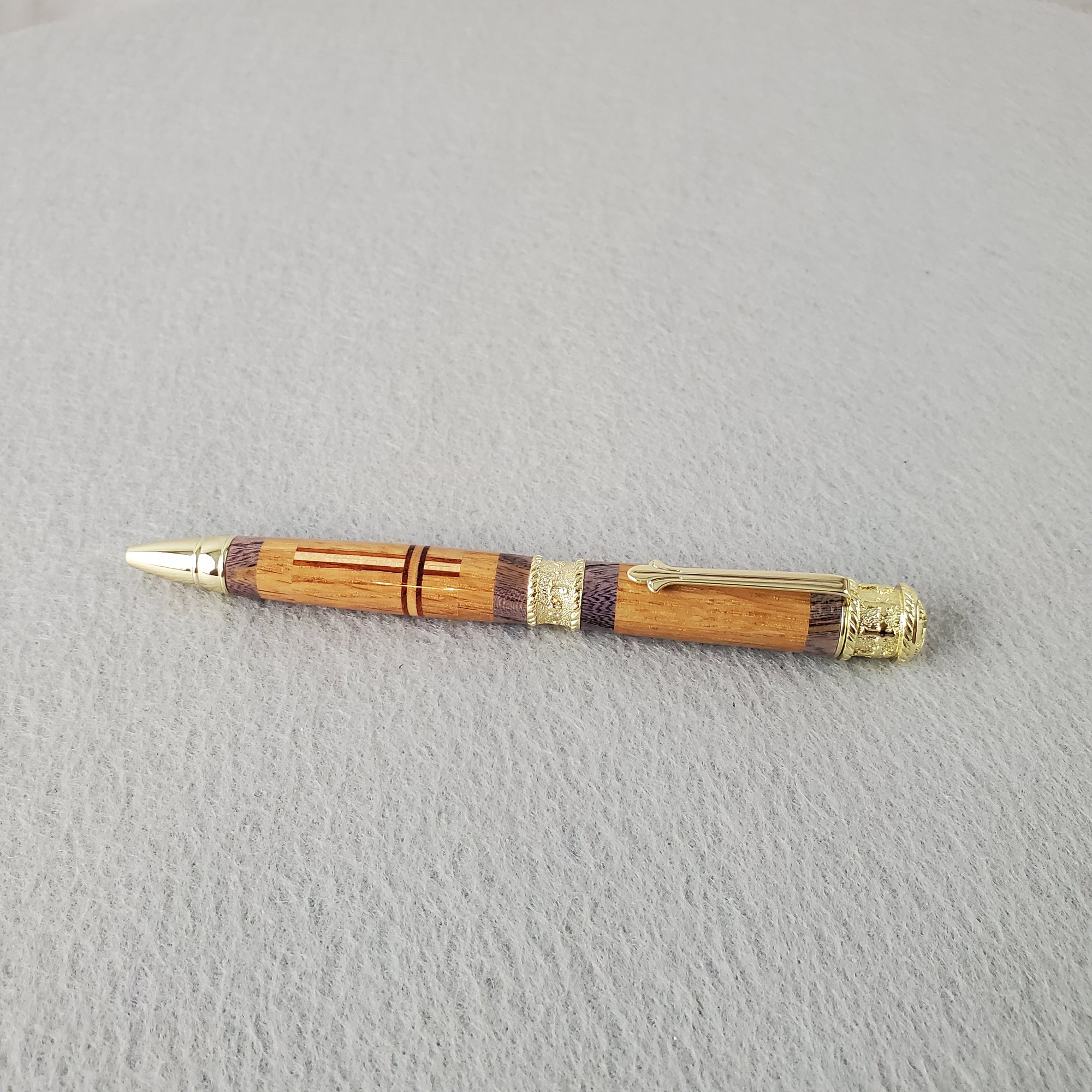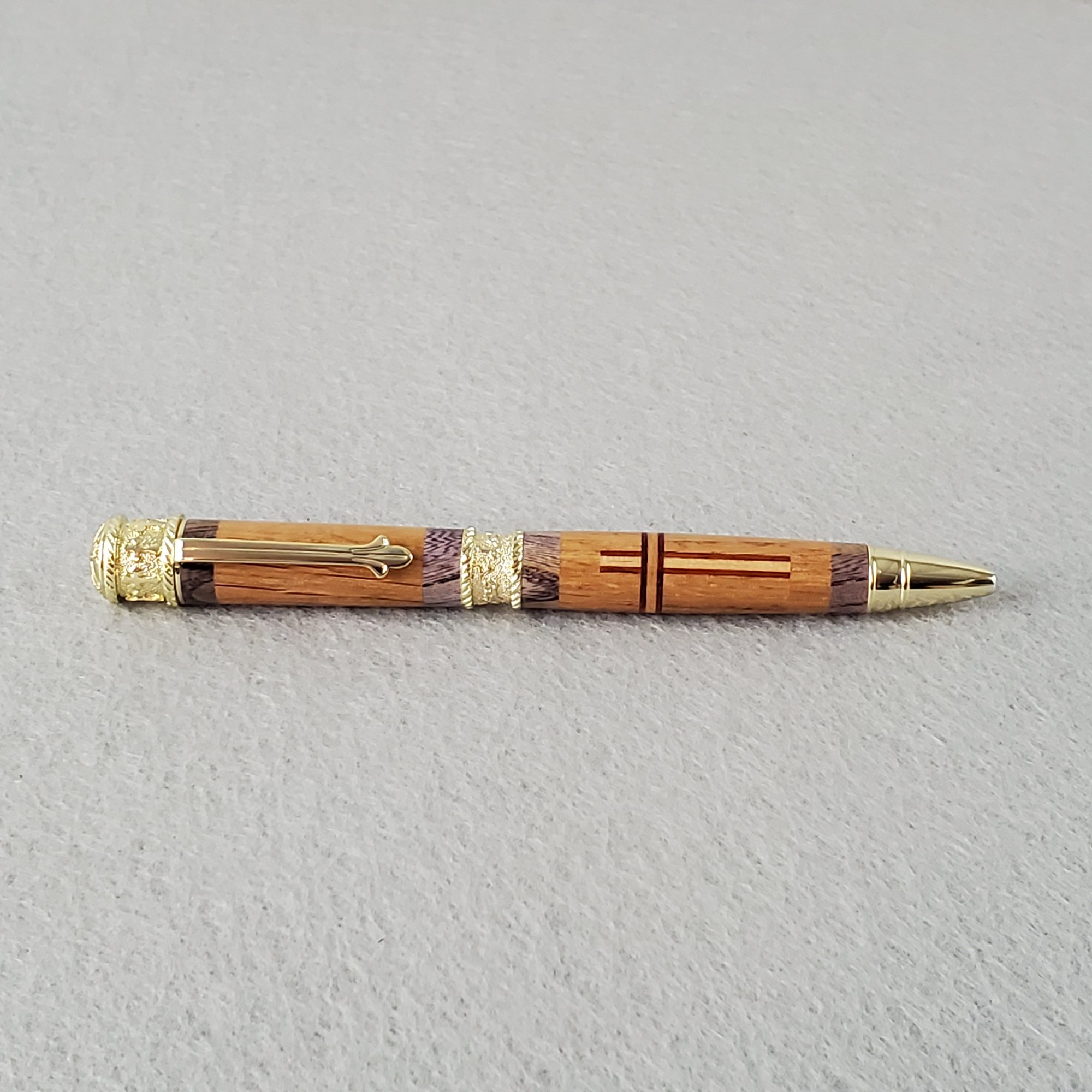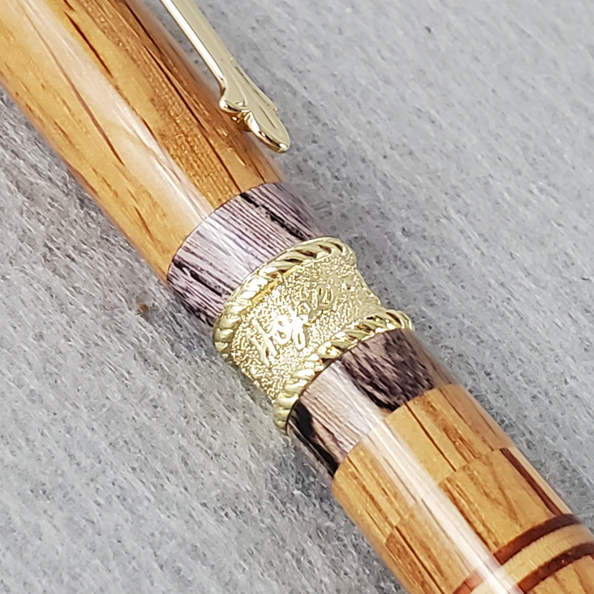 A custom ballpoint pen that was made using reclaimed wood from the interior oak trim from a church that was razed for expansion space. The pen consists of twelve pieces of wood. Two main pieces of natural oak, four pieces of stabilized purple and purple dyed wood, and six pieces of very thin laminated wood to make the cross. The cross is not a decal, as it is solid wood that runs through the entire wood blank thus giving a front and back surface.