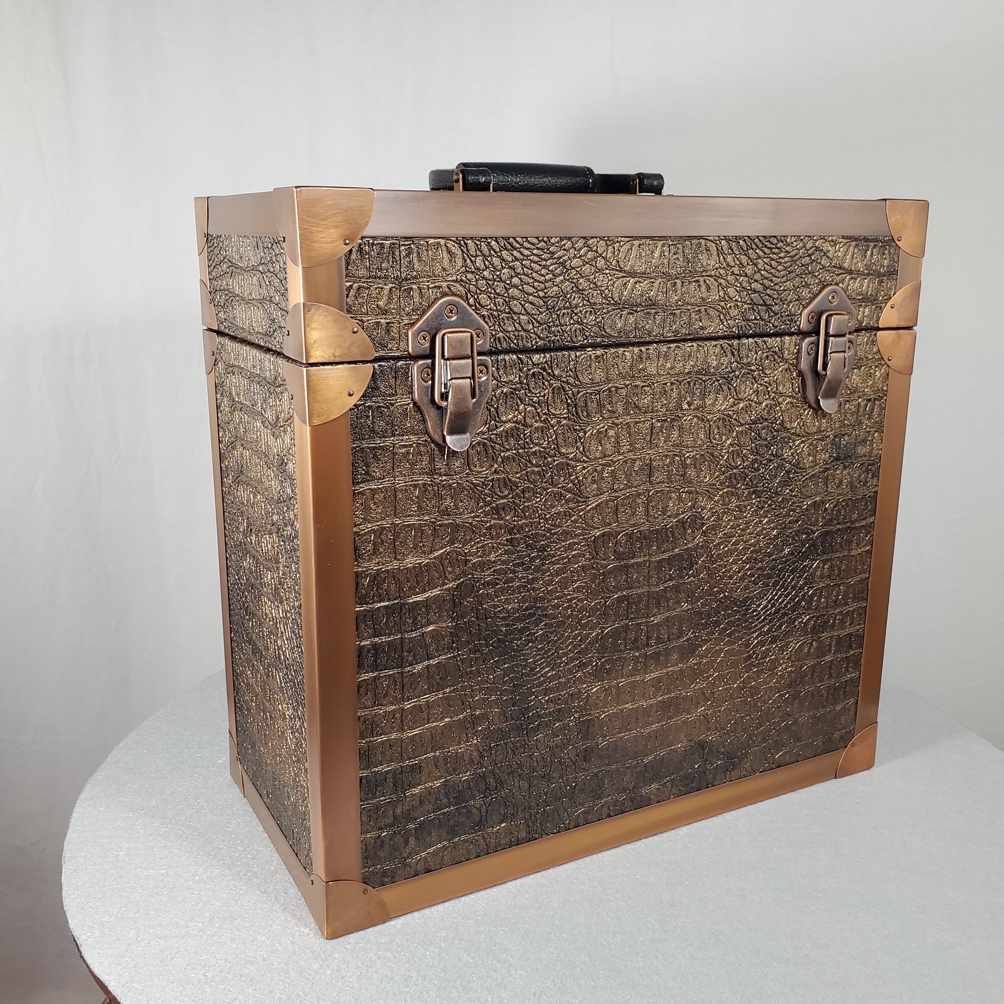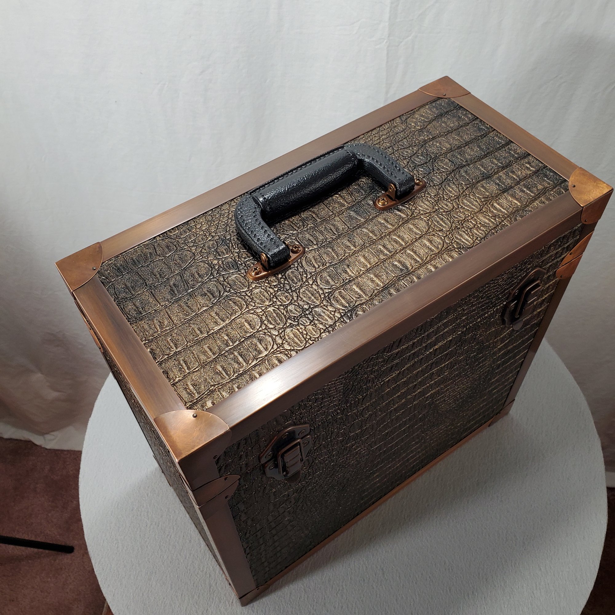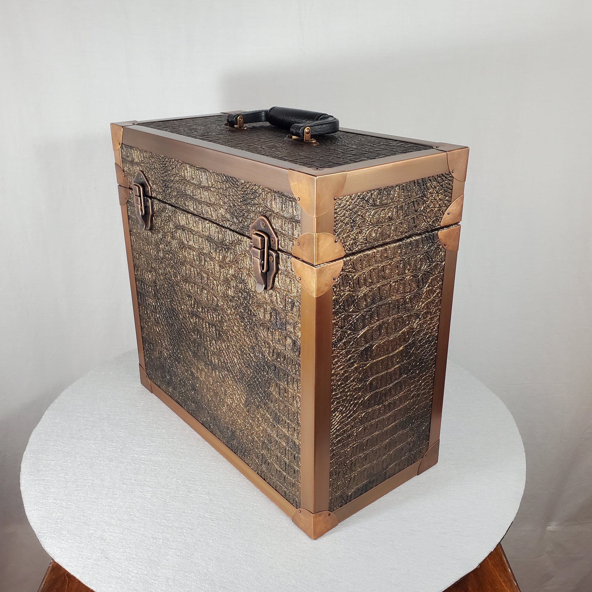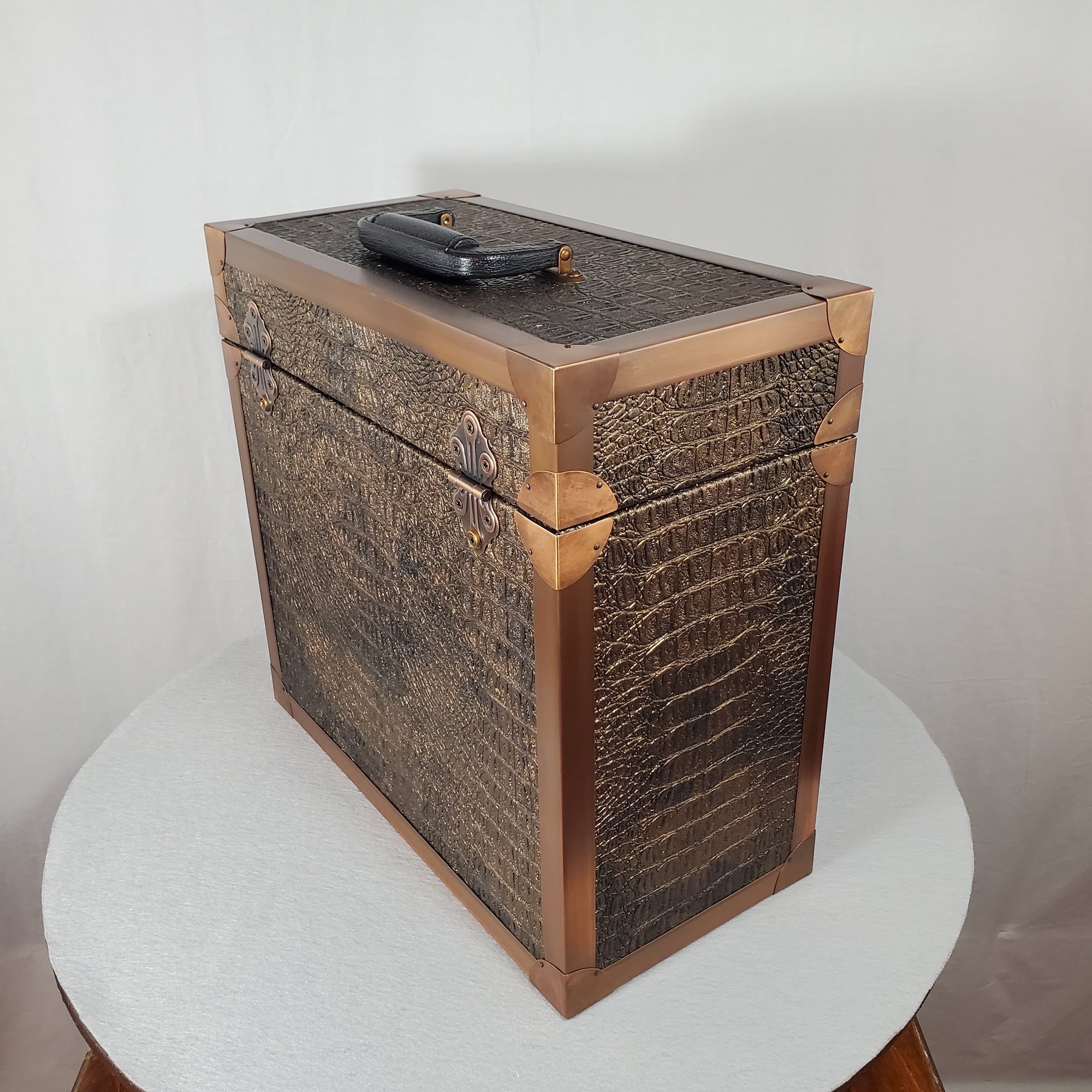LP record carry case that is handmade with solid wood, Gator upholstery leather outside with solid copper protective corners and edging. The copper edging and corners were hand formed from copper coil stock. A hand rubbed antiqued finish is applied to all the copper pieces. Heavy duty snap closures prevent case from opening when carrying. A metal and resin handle that is bolted through the top of the case for reinforced strength for carrying the weight of approximately 40 twelve inch 33 1/3 single cover LP's.