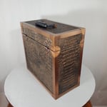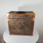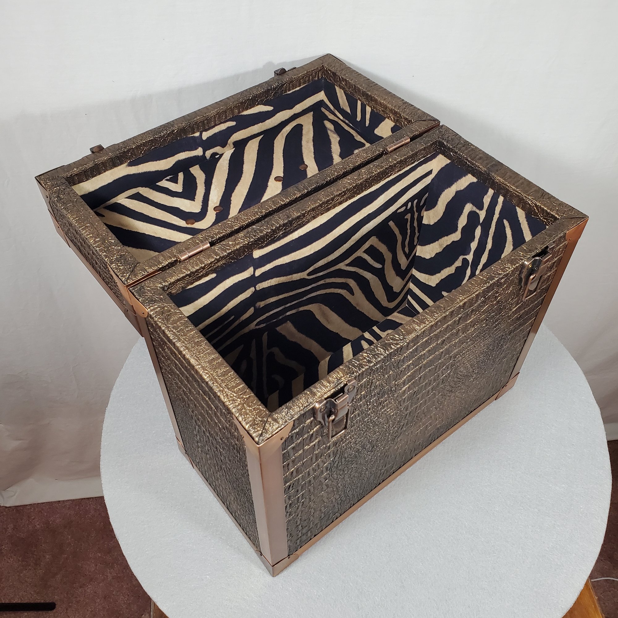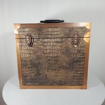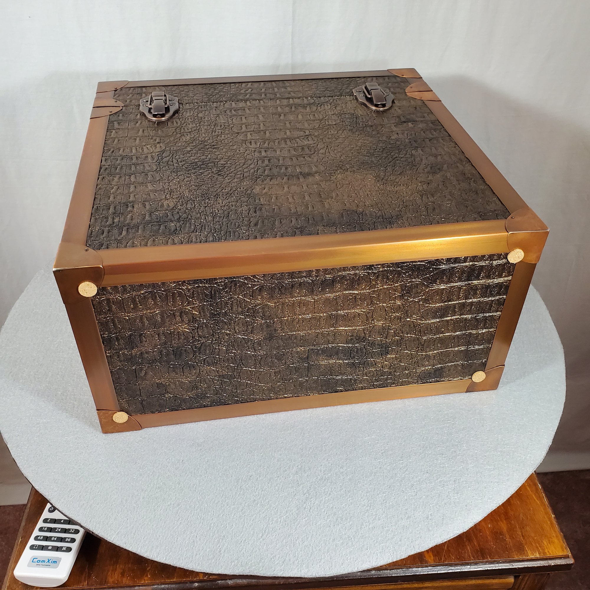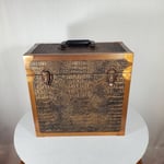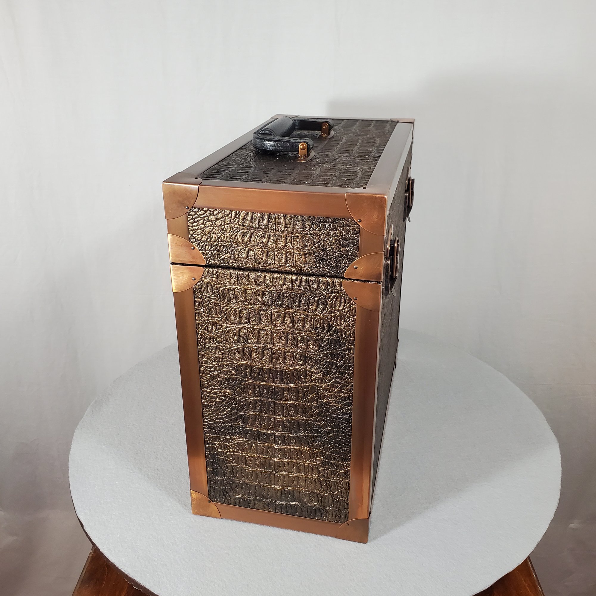 LP record carry case that is handmade with solid wood, Gator upholstery leather outside with solid copper protective corners and edging. The copper edging and corners were hand formed from copper coil stock. A hand rubbed antiqued finish is applied to all the copper pieces. Heavy duty snap closures prevent case from opening when carrying. A metal and resin handle that is bolted through the top of the case for reinforced strength for carrying the weight of approximately 40 twelve inch 33 1/3 single cover LP's.
