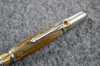 This is a very sharp looking pen that will make great conversation along with great pen writing capabilities. Hardware on this pen is antiqued pewter and antiqued brass plating that goes very good with the brownish and green feathers in the pen body.