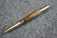 Pheasant feather ballpoint that has two vintage Pheasant feathers from the 1970 era. Feathers are applied on a wooded outdoor scene, cast in clear resin. A great nature pen for the pheasant hunter or outdoors person.